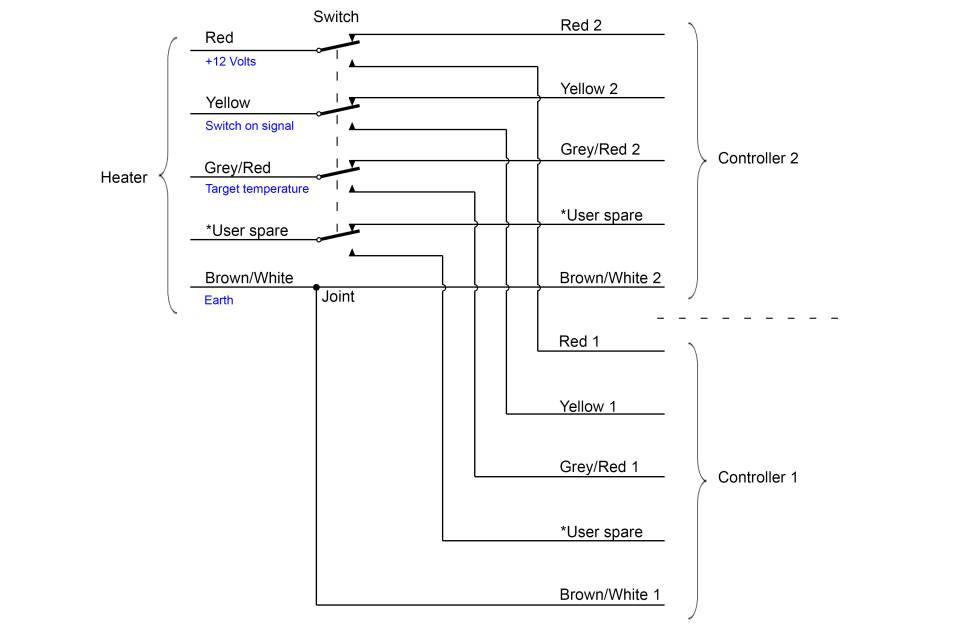 The spare switch element *User spare can be wired to switch the blue/white or grey if needed, or it could switch power to a LED to indicate which controller is in use.