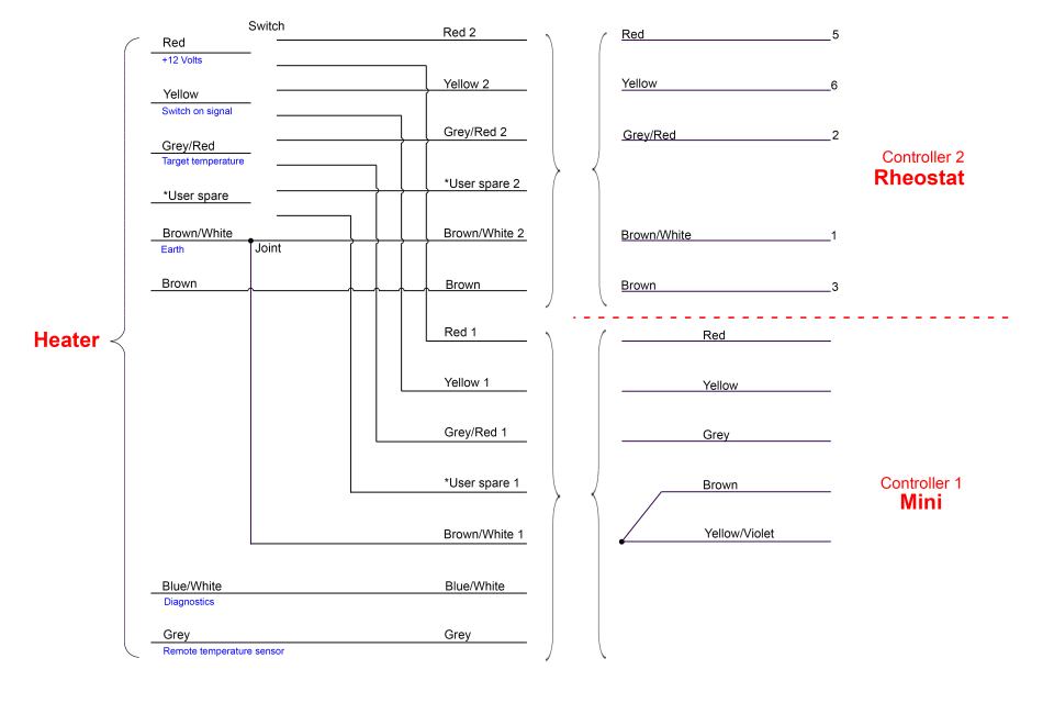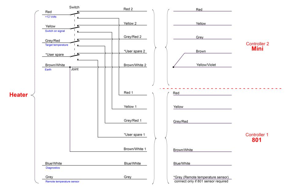 Similarly only one controller can be connected to the blue/white diagnostics wire and only one external temperature sensor can be connected to the grey.