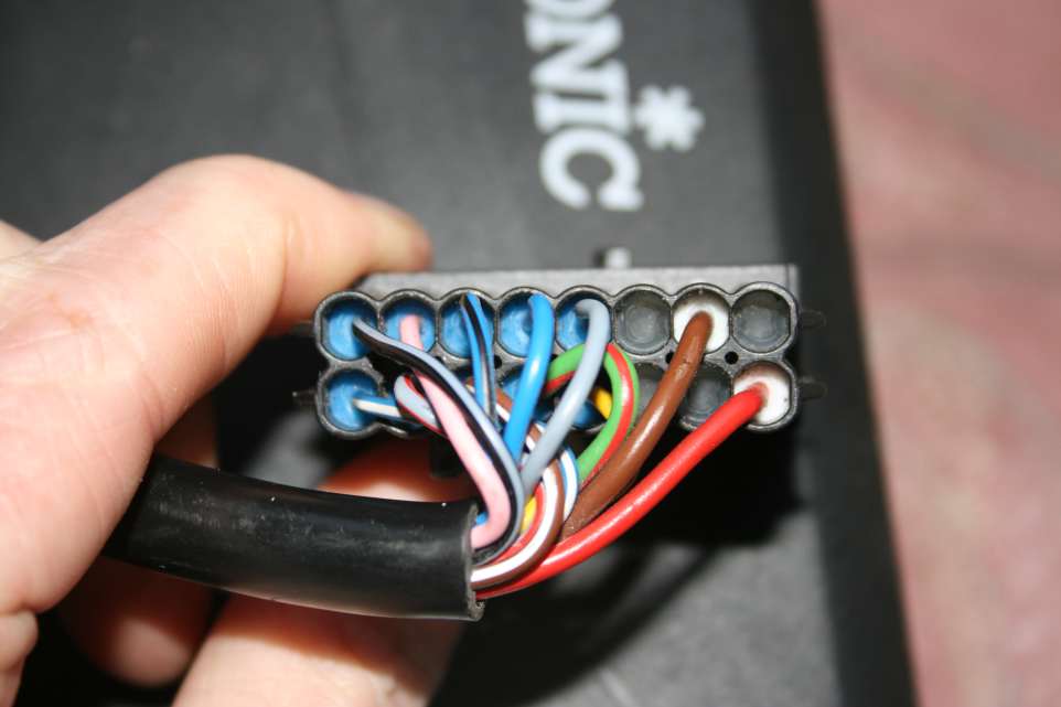 The insulation prevents easy testmeter access to the pins. Positive red wire on pin 1, Negative brown wire on pin 10.