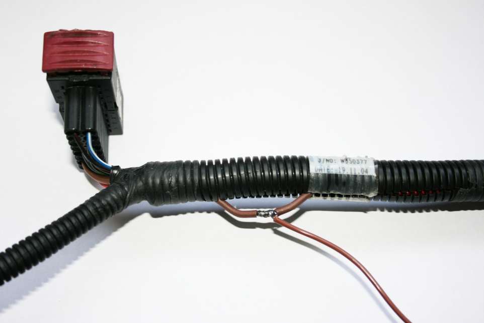 The obvious place to make the connections would be to the short length of exposed wire between the loom and loom connector. Personally I don't like making connections here as the wiring generally experiences maximum mechanical stress close to the connectors. I prefer to make the connection further up the cable and to hide the joint inside the loom sheath which gives a more professional appearance, there are similar joints hidden higher up in the loom. The difference in voltage reading between these two points is negligible and the joint has better mechanical protection.
