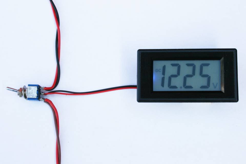 I used a toggle switch from my spares box which might be slightly different from the one you get but the connection details should be the same. The centre off position allows the meter to be disconnected when not in use. However the current consumption is very low, a 100 AH battery would power the voltmeter for more than a year if there were no other losses or battery deterioration.