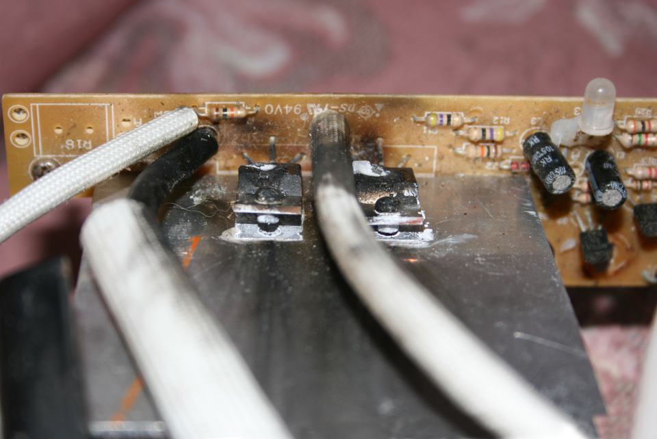 I bent the pins of the replacements to fit into the pcb with the transistor flush to the heatsink, trying to fit the new ones in the same position on the heatsink as the surface underneath was clear of any smoke damage.