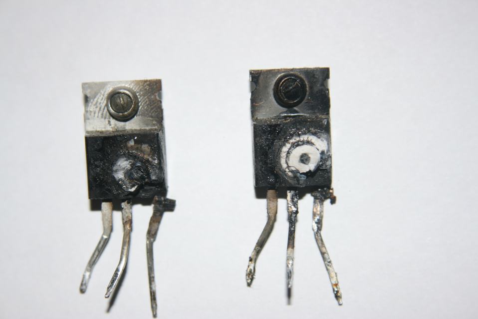 Some smoke had fused into the hot aluminium surface and remained on the non critical areas after cleaning. I resisted the urge to clean the transistor contact area with abrasive paper, even fine grits would scratch the polished aluminium surface and reduce the heat transfer.