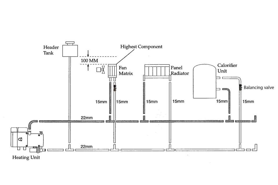 Conventional home central heating systems have a single pipe from the header tank to the piping as shown on the right. This allows for expansion of the water and to top up small losses of water. Eberspacher water heaters generally use two pipes as in the arrangement on the left where the hot water flows through the header tank.This increases the thermal capacity of the system which reduces the number of times the heater drops into standby. Two pipe header tanks installations as shown are preferred for 4 and 5kw heater models. On larger heaters routing the main return via the tank is too restrictive on flow rate and it is usual to fit with a heater matrix or radiator return going through the header tank.